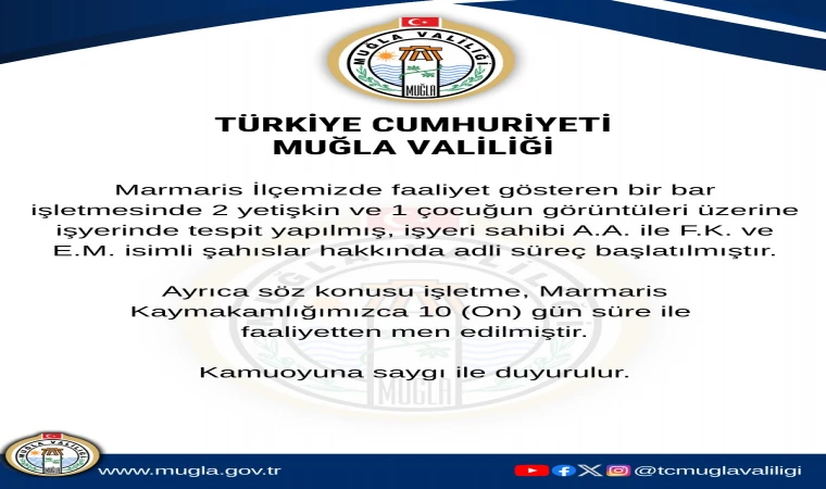 Sebiha ARSLAN : Marmaris'te faaliyet gösteren bir bar işletmesinde 2 yetişkin ve 1 çocuğun görüntüleri üzerine yapılan tespitler sonucunda, ilgili işyeri hakkında işlem başlatıldı.