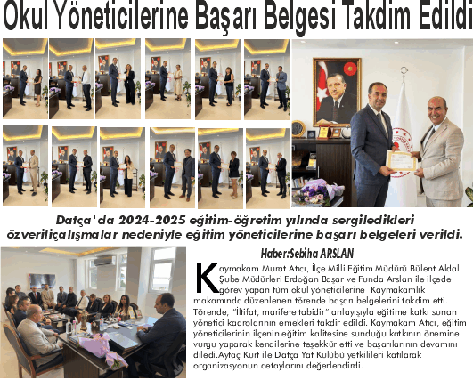 Sebiha ARSLAN : Datça’ da 2024-2025 eğitim-öğretim yılında sergiledikleri özverili çalışmalar nedeniyle eğitim yöneticilerine başarı belgeleri verildi.