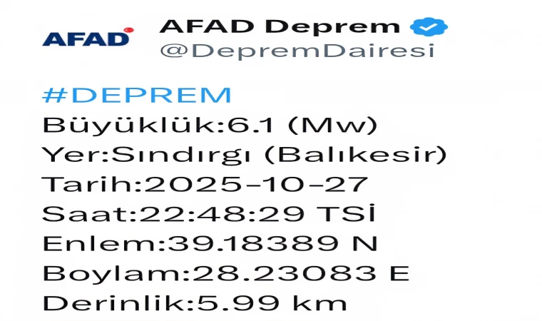 Sebiha ARSLAN :Balıkesir’in Sındırgı ilçesi, son aylarda yaşanan sarsıntıların ardından bir kez daha depremle gündeme geldi. Afet ve Acil Durum Yönetimi Başkanlığı (AFAD), 27 Ekim 2025 Pazartesi gecesi saat 22.48’de meydana gelen depremin 6.1 büyüklüğünde olduğunu duyurdu.