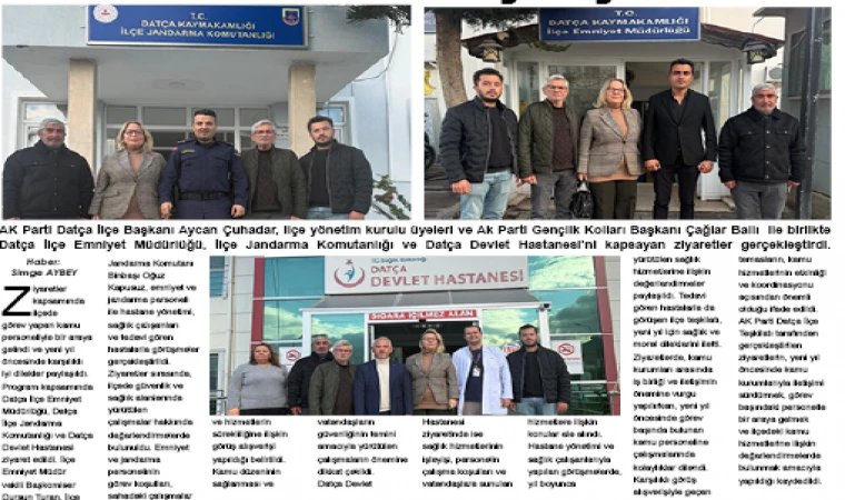 AK Parti Datça İlçe Teşkilatı tarafından gerçekleştirilen ziyaretlerin, yeni yıl öncesinde kamu kurumlarıyla iletişimi sürdürmek, görev başındaki personelle bir araya gelmek ve ilçedeki kamu hizmetlerine ilişkin değerlendirmelerde bulunmak amacıyla yapıldığı kaydedildi.